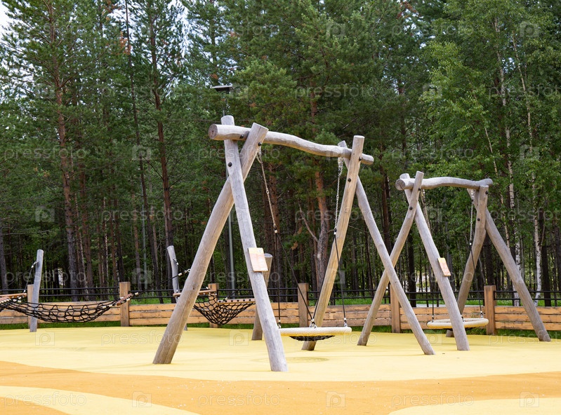 Оригинальные деревянные качели в центральном парке города Ноябрьска летом
