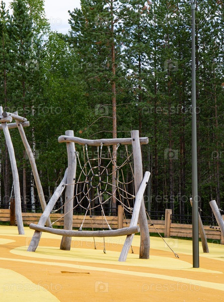 Оригинальные деревянные конструкции в центральном парке города Ноябрьска летом
