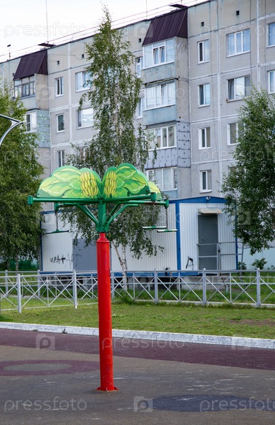 Оригинальная железная скульптура на детской площадке города Ноябрьска летом