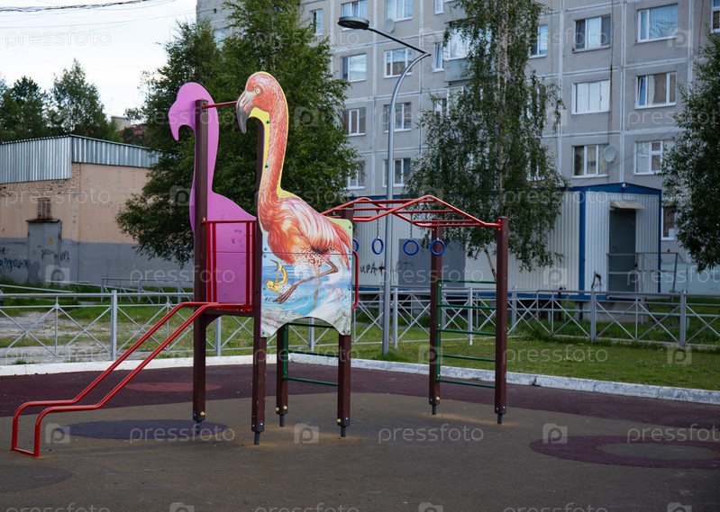 Оригинальная скульптура из дерева в виде птиц фламинго на детской площадке в городе Ноябрьск летом