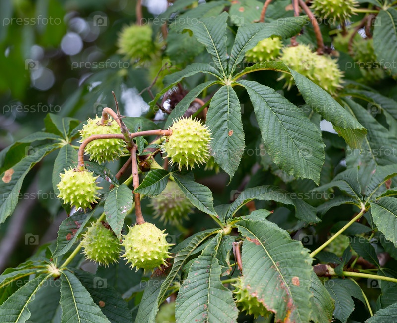 Красивые зеленые круглые колючие шишки на хвойном дереве в старом парке Анапы летом