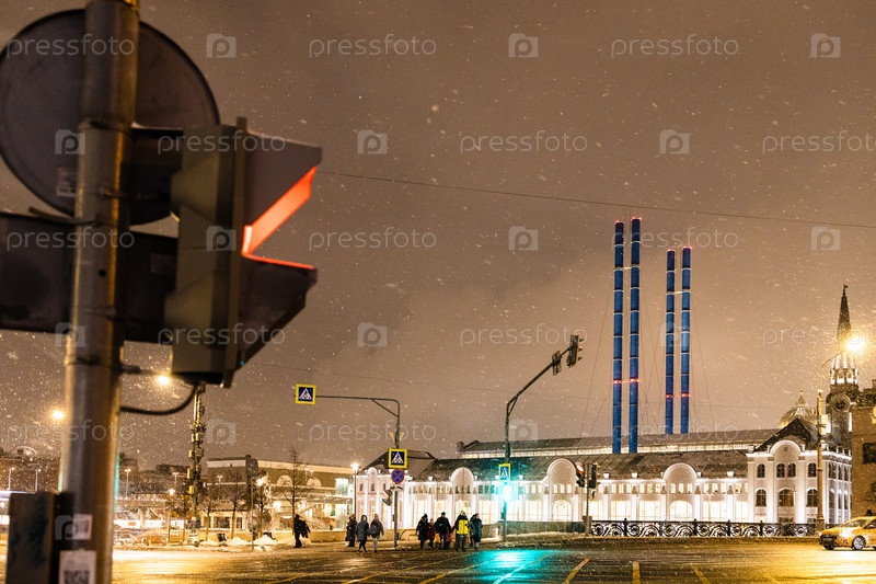 Пешеходный переход в снегопад в Москве вечером