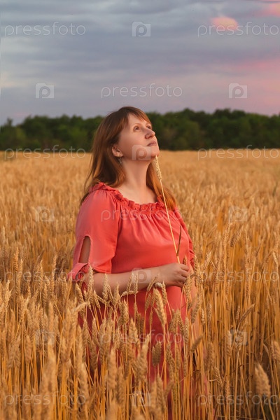 Женщина на пшеничном поле смотрит на закат