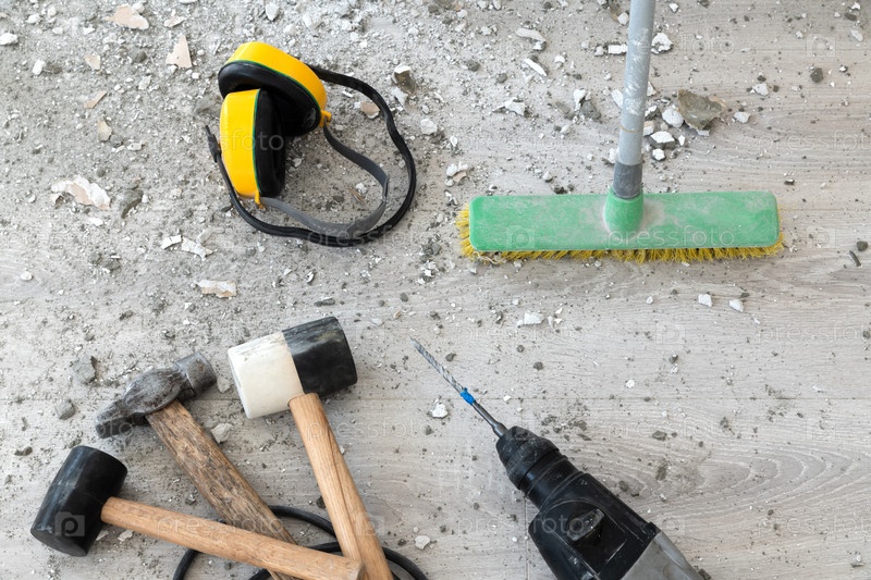 Концепция шумной и грязной работы. Кусочки старой штукатурки на полу