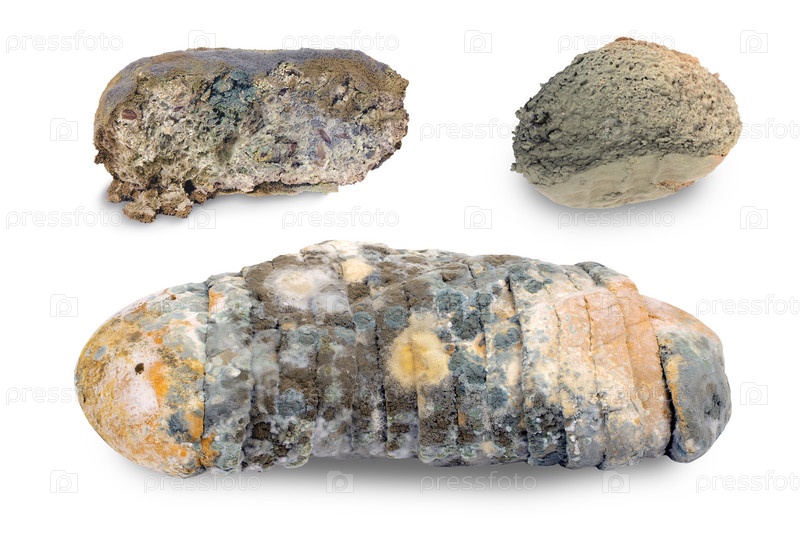 Заплесневелый испорченный хлеб на белом изолированном фоне