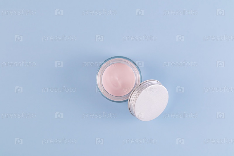 Открытая стеклянная прозрачная банка с розовым кремом для молодой кожи лица и тела на синем фоне с копировальным пространством. Натуральная косметика