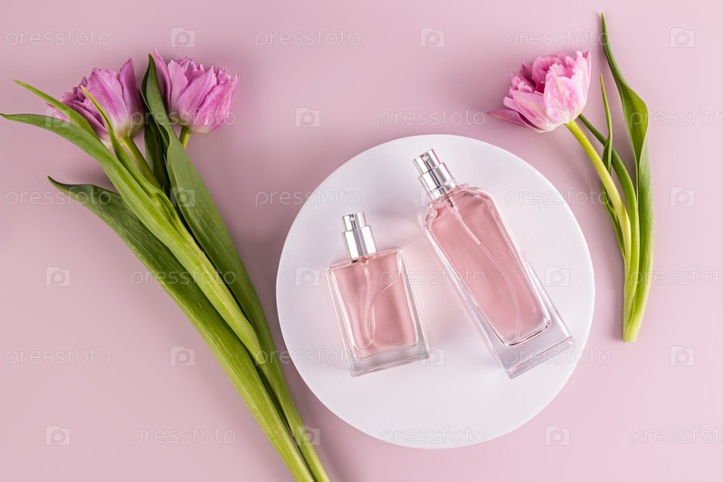 Два прозрачных флакона разной формы с духами лежат на круглом белом подиуме среди тюльпанов. Концепция красоты и парфюмерии. Вид сверху