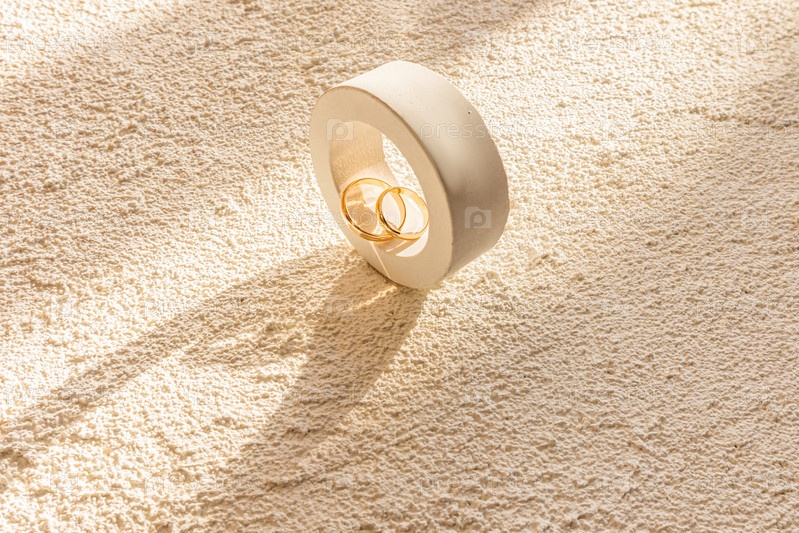 Два золотых обручальных кольца лежат внутри бетонного круглого подиума с красивой тенью от солнечных лучей. Бетонный рельефный фон. Копировальное пространство
