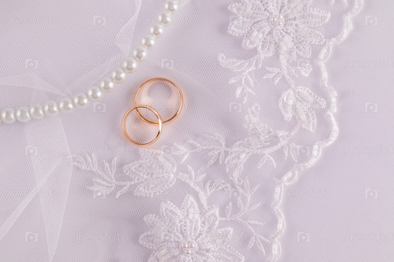 Шикарный свадебный фон для поздравительной открытки, приглашения, дизайна обложки. нежная белая вышивка цветов, два золотых обручальных кольца, жемчужные бусы