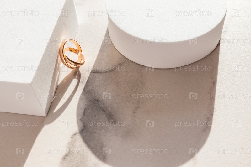 Два классических золотых кольца опирались на белый кубический подиум. Мраморный фон. Солнечный лучик. тень фигур. Копия помещения. Макет для дизайна
