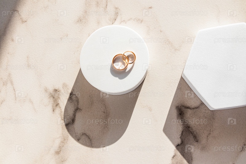 Два классических золотых обручальных кольца лежат на белом круглом подиуме на мраморном фоне в лучах солнца. Вид сверху. Копия помещения. макет