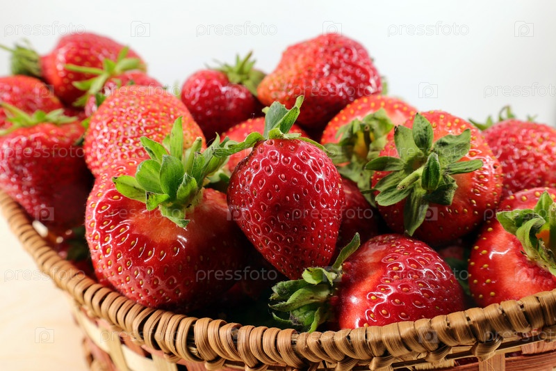 Много спелой клубники лежит в плетеной корзине
