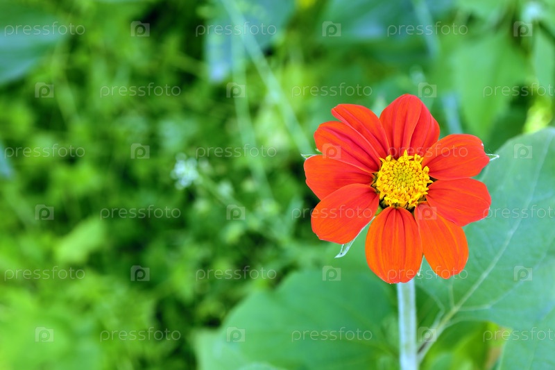 Ярко-красный с желтым центром цветок титонии на размытом зеленом фоне
