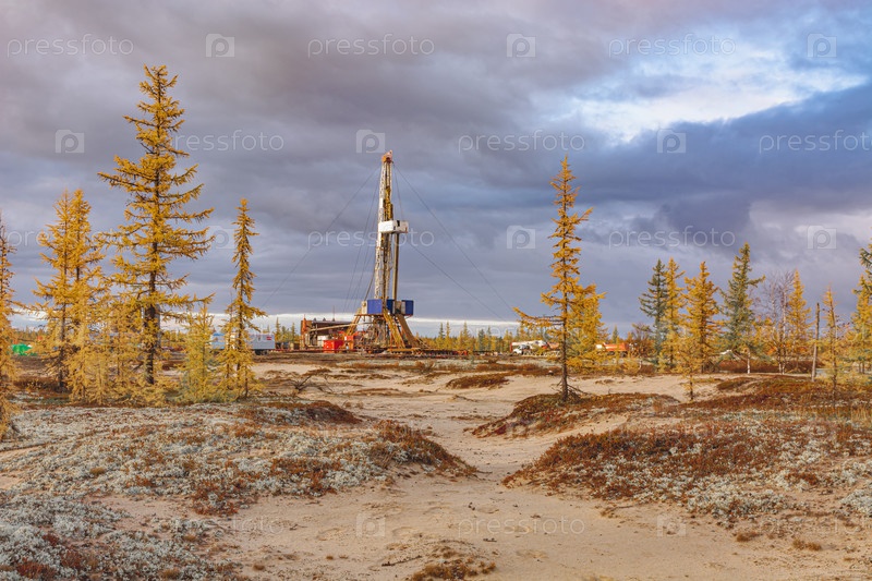 Северная тайга осенью. Золотисто-желтая палитра. Пейзаж на месторождении нефти и газа. Буровая установка стоит между деревьями как центральный элемент композиции