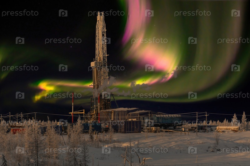 Зимний пейзаж полярной ночью с буровой установкой. Северное нефтегазовое месторождение. На заднем плане красивое небо с северным сиянием