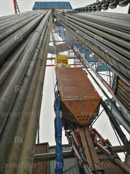 Внутреннее устройство буровой установки. Верхний силовой привод буровой установки, оборудование для спуска и подъема труб. Бурильные трубы установлены вертикально