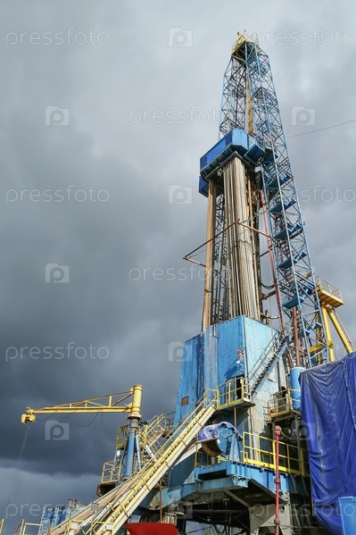 Общий вид конструкции буровой установки для бурения нефтяных и газовых скважин. Нефтяная вышка, оборудование и коммуникации. Бурильные трубы стоят вертикально
