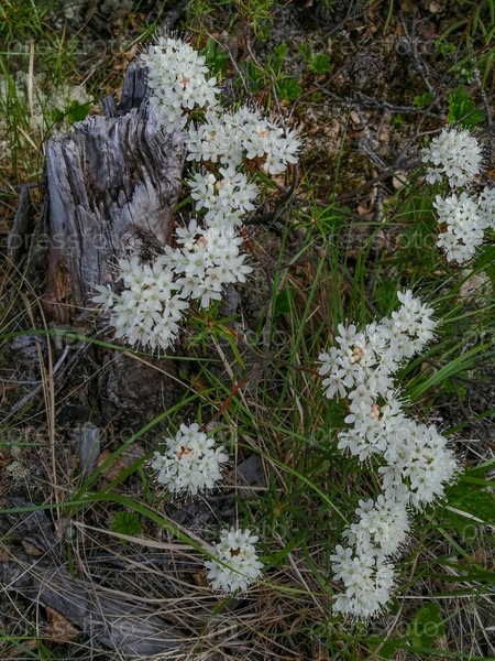 Маленькие белые соцветия кустарника багульника из семейства вересковых рода рододендронов, растущего в северной тундре. Летняя природа тундры. Уникальная полярная флора