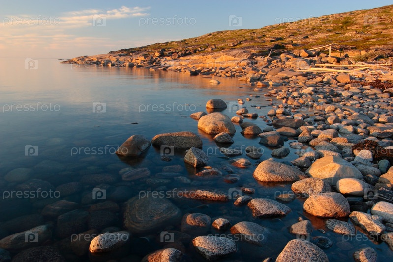 Остров Большая Нохкалуда Камни побережья на закате. Штиль. Белое море. Северная Карелия. Лето 2006 года