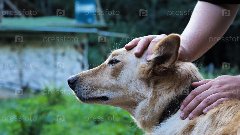 Нежный момент между мужчиной и собакой. Мужчина ласково чешет собаку по голове, вызывая чувство товарищества и любви