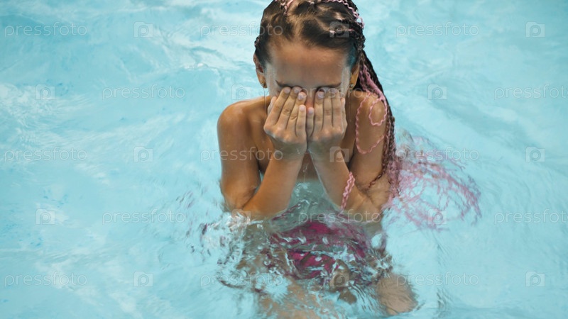 Девушка, стоящая по пояс в прозрачной голубой воде бассейна, над поверхностью которой видна только ее голова и верхняя часть розового купальника. Ее волосы заплетены в несколько косичек