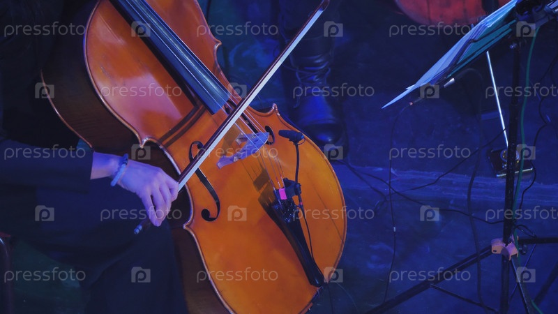 Крупный план виолончели, подчеркивающий ее деревянную текстуру и замысловатые детали. Изображение передает суть инструмента. Человеческая рука со смычком направляет струны