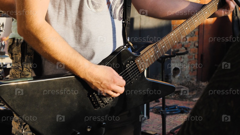 Видно тело человека, страстно играющего на электрогитаре, олицетворяющего музыкальный талант и дух рок-н-ролла