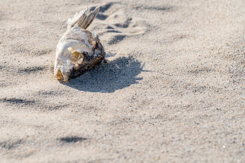 Скелет сушеной рыбы лежит на песке