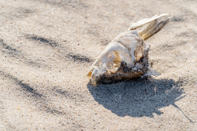 Скелет сушеной рыбы лежит на песке