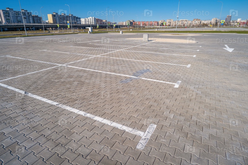 Открытое пространство с дорожными знаками и дорожной разметкой, дорожными перекрестками, пешеходными переходами, солнечным днем, голубым небом, фоном городского пейзажа