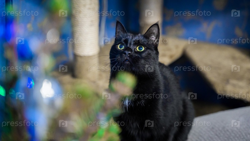 Черный кот с удивлением смотрит на елку с праздничными огнями