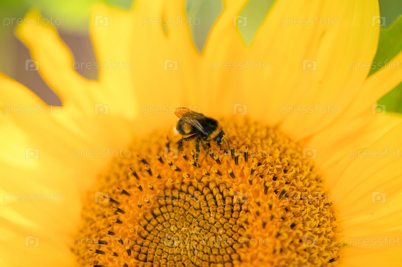 Милый мохнатый шмель сидит на подсолнухе в ясный солнечный день, позитивный образ