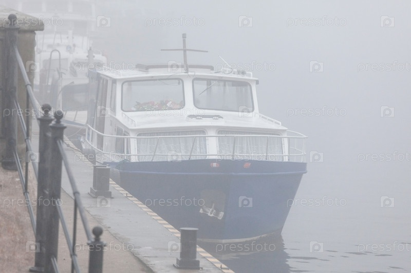 Лодки стоят у причала из-за сильного тумана
