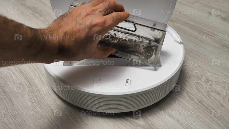 Рука выгружает пылесборник робота-пылесоса в мусорное ведро