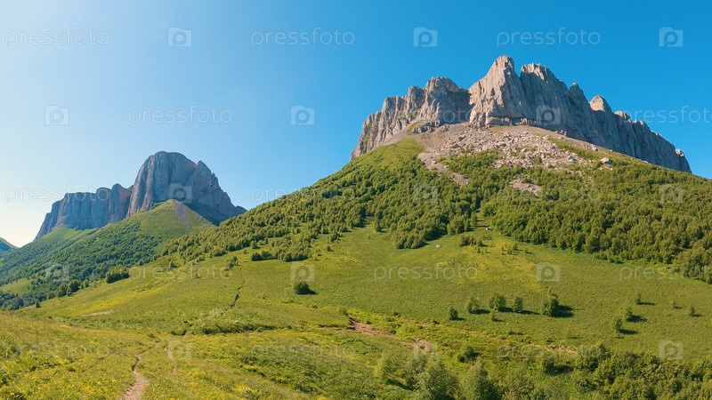 Захватывающий горный пейзаж с пышными зелеными деревьями. Небольшая тропинка в левом нижнем углу намекает на возможность приключений и исследований. Крутые скалы Огре в центре кадра