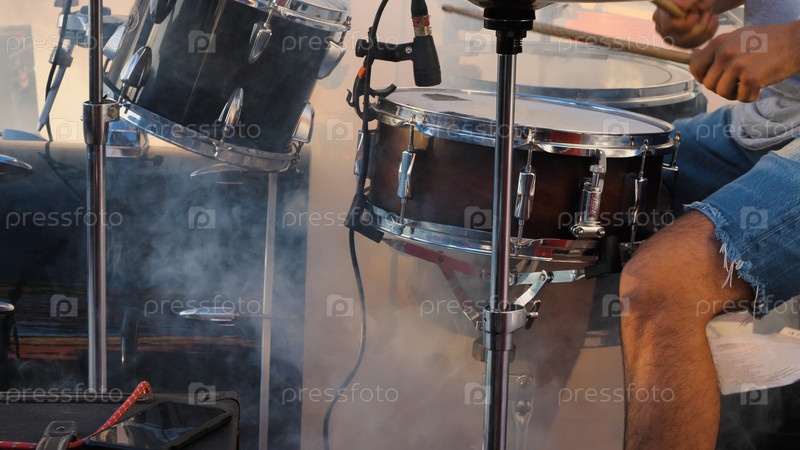 Барабанщик в джинсовых шортах играет на ударной установке. Картина прекрасно передает суть ритма и мелодии