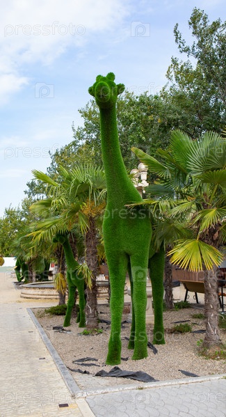 Зеленая скульптура в виде жирафа в парке села Витязево летом