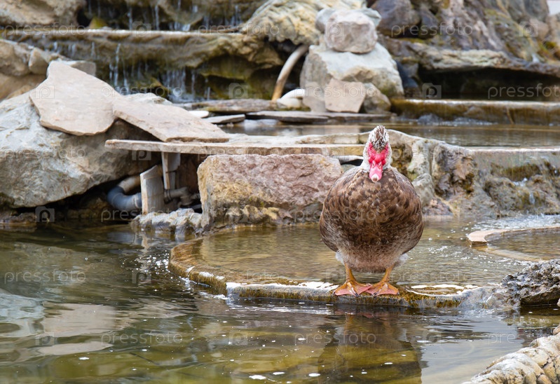 Утка в небольшом пруду среди скал весной