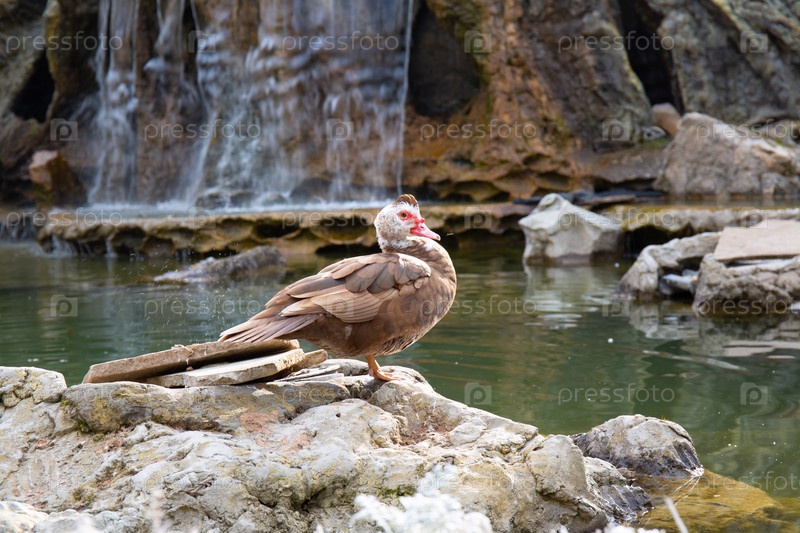 Утка в небольшом пруду среди скал весной