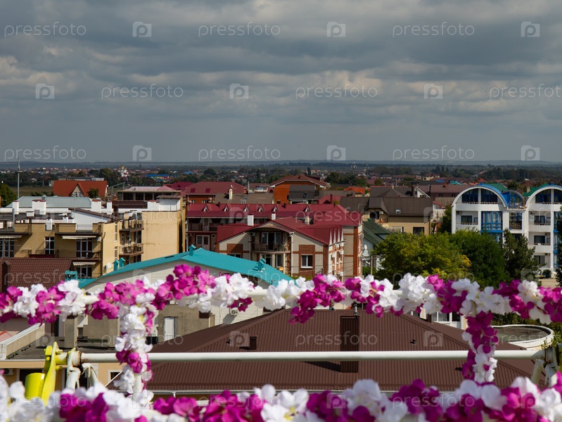 Вид на красивые здания с колеса обозрения в деревне Витязево летом