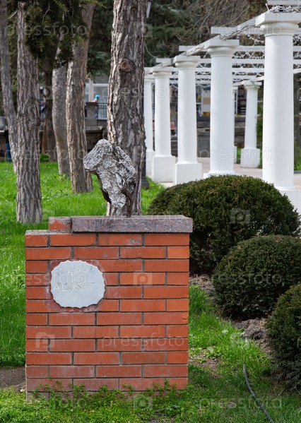 Скульптура в виде камня на кирпичном постаменте «Капри в Алуште» в парке города Алушты Крым