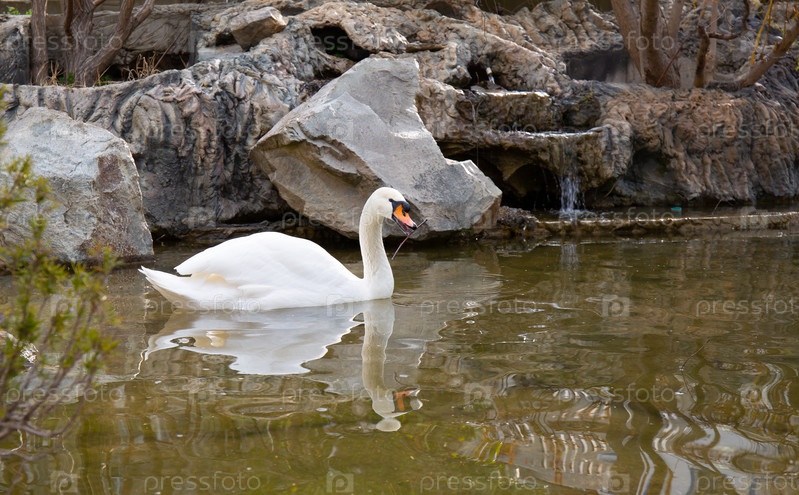 Белый лебедь в небольшом пруду среди скал