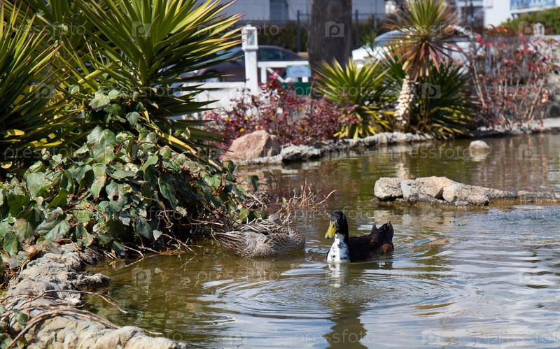 Утка в небольшом пруду среди скал весной
