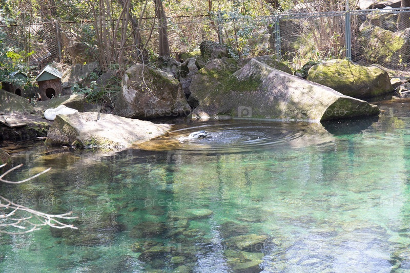 Утка в небольшом пруду среди скал весной