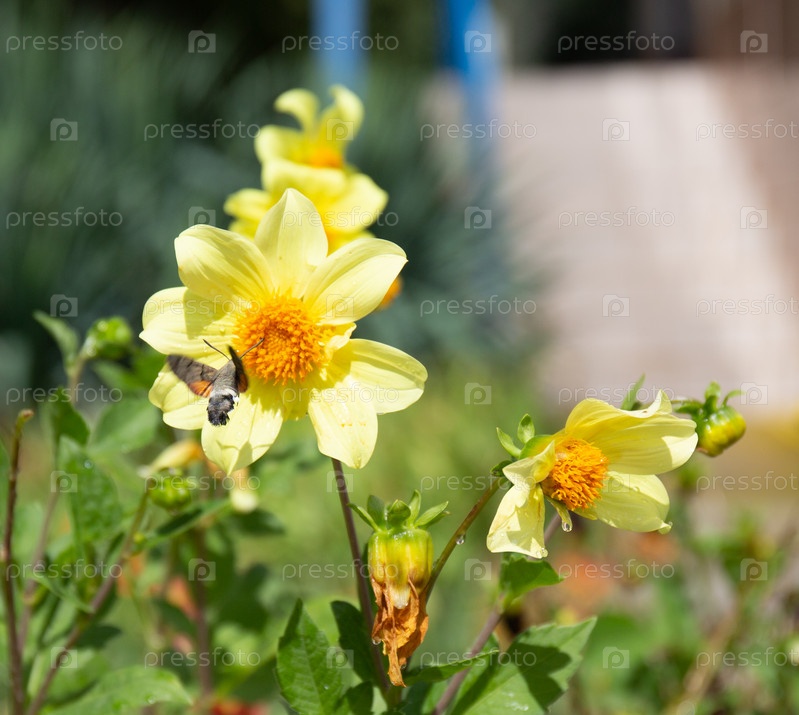 Языкан обыкновенный или большерабочий звездный ((Macroglossum stellatarum) бабочка из семейства сфингидов (Sphingidae) летом собирает пыльцу от красивого цветка в старом парке