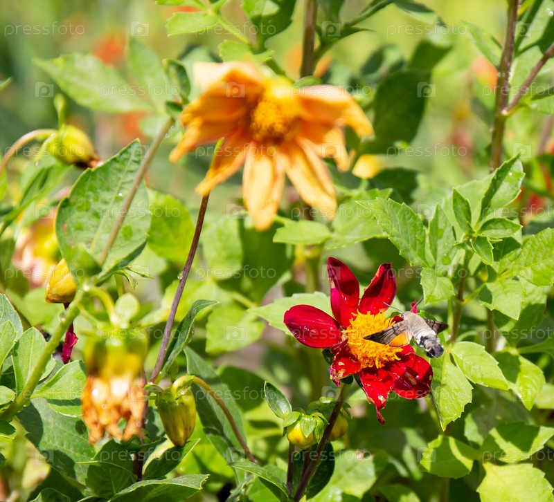 Языкан обыкновенный или большерабочий звездный ((Macroglossum stellatarum) бабочка из семейства сфингидов (Sphingidae) летом собирает пыльцу от красивого цветка в старом парке