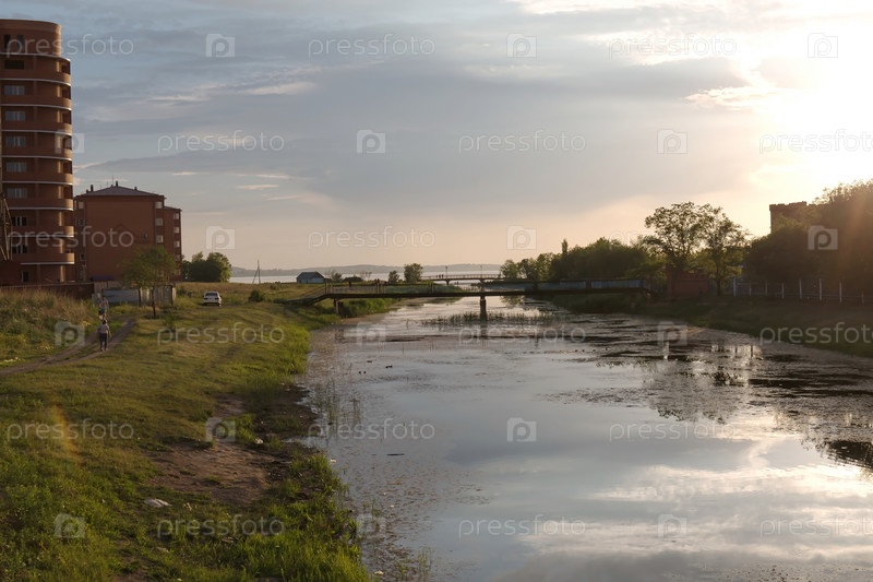 Вечерний вид на реку Копа в центре города Кокшетау, Республика Казахстан летом