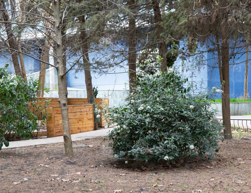 Цветущий куст среди деревьев в старом парке весной в городе Алушта в Крыму