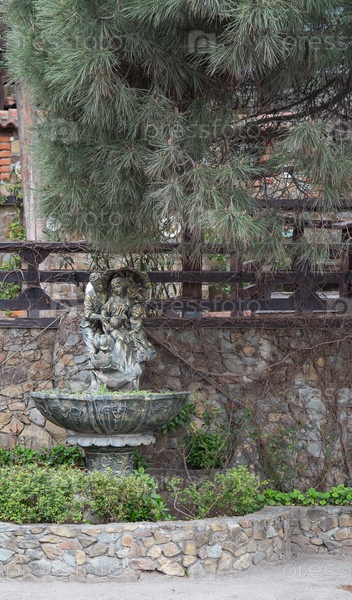 Небольшая каменная скульптура фонтана в виде семьи с ребенком в парке города Алушта Крым