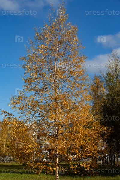 Осенняя береза с желтыми листьями в центре Ноябрьского Ямала